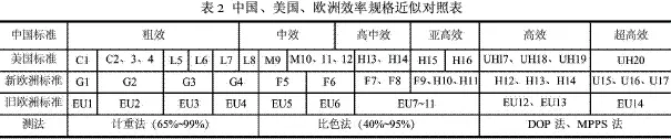 (2)過濾器效率分類過濾效率是在特定測(cè)試方法下的測(cè)試值,在標(biāo)記效率值時(shí)必須注明相應(yīng)的測(cè)試方法,不同的國(guó)家有不同的表示方法,見表2。