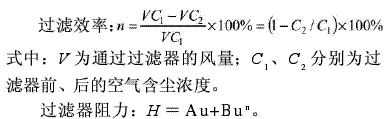 式中:A為濾料層結(jié)構(gòu)特性系數(shù);B為過濾器結(jié)構(gòu)阻力系數(shù);u為過濾器面風(fēng)速,m/s;n為試驗(yàn)指數(shù)。容塵量:當(dāng)過濾器的阻力(在額定風(fēng)量下)達(dá)到終阻力時(shí),過濾器所容納的塵埃質(zhì)量。