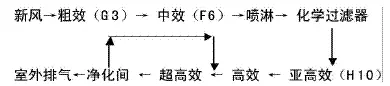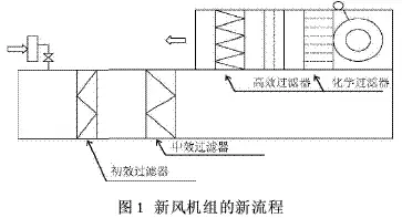 此外,為解決由于通過各個(gè)高效過濾器的風(fēng)量不同而引起的個(gè)別循環(huán)空調(diào)機(jī)中的高效過濾器更換的頻度高的問題,可以在新風(fēng)機(jī)中加裝化學(xué)過濾器和亞高效過濾器,將新風(fēng)集中處理而不是將新風(fēng)送到各循環(huán)風(fēng)機(jī)中再進(jìn)行處理,以減少由于各個(gè)循環(huán)風(fēng)機(jī)風(fēng)量的不同而增加的更換量。此問題已經(jīng)在我公司的新工程中得到了改善。在201#棟的新工程中新風(fēng)空調(diào)機(jī)組采取的新流程如圖1所示。
