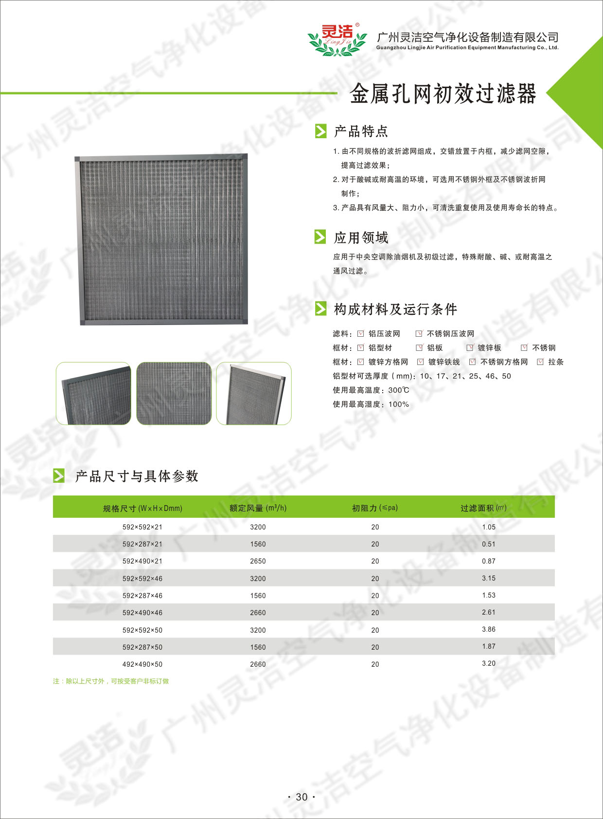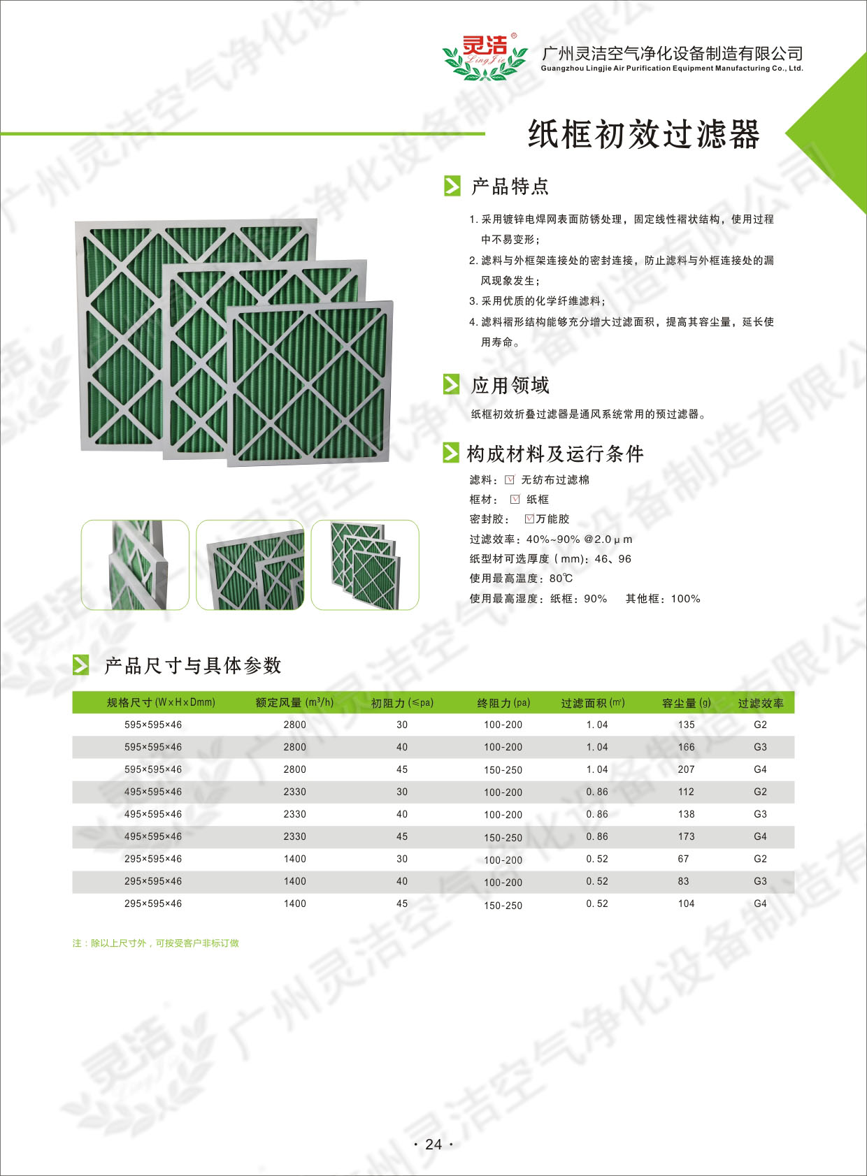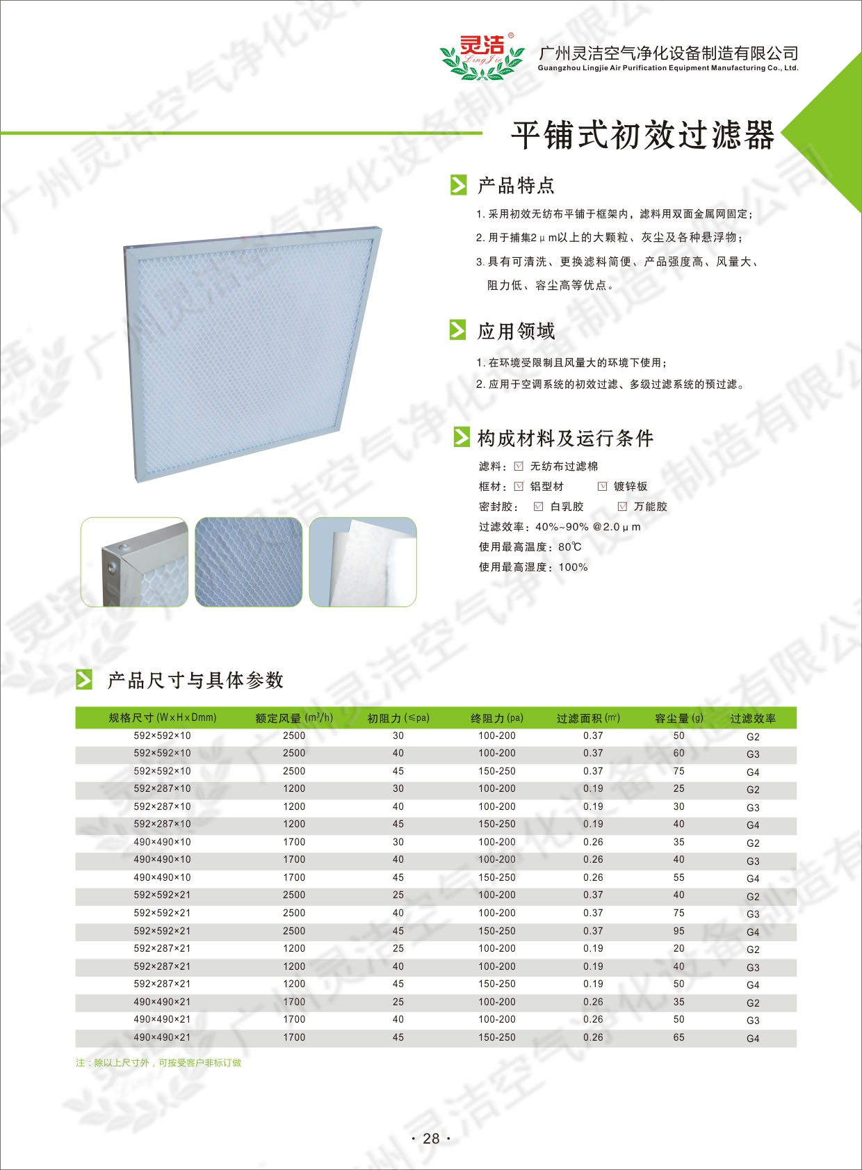 初效過濾器結構一般分為龍骨架和框骨架。龍骨架的特點是結實,濾材分布均勻,但制作費時費工??蚬羌艿奶攸c是更換濾料方便,制作省時,強度比龍骨架略差。外框材料有紙框、鋁框、鍍鋅鐵框,過濾材料有無紡布、尼龍網、活性碳濾材、金屬孔網等,防護網有雙面噴塑鐵絲網和雙面鍍鋅鐵絲網。